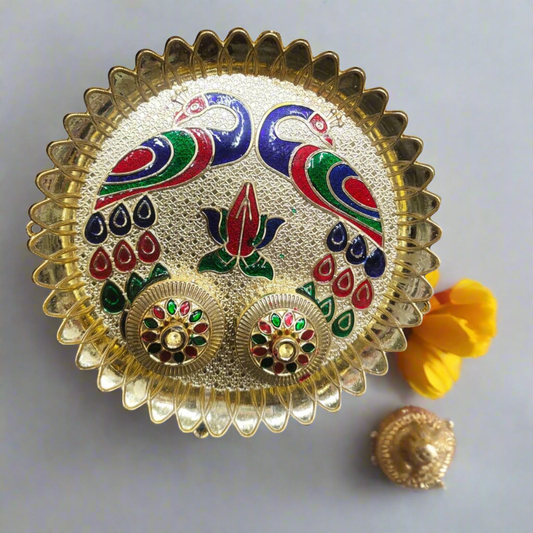 Decorative menna work mor design puja thali/plate with roli chawal dibbi 🦚 for puja/Wedding/Gifting/karwa chauth 🌹size 8.1*inch