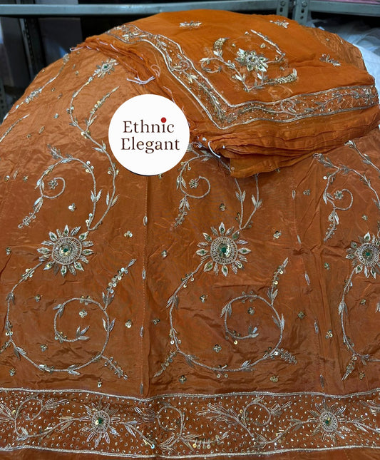 Elegant Rajasthani Poshak | Heavy Jardoji & Dabka Hand Work Odhna | Natural Crepe / Tissue Fabric Set
