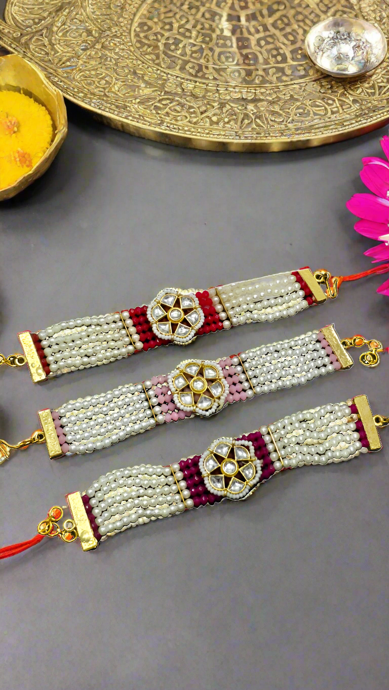 Celebrate the bond of love with our exquisite kundan work pearl bracelet Rakhi. Handcrafted with intricate designs, each bracelet Lumba Rakhi features vibrant , beads, and embellishments. Perfect for honoring your sister or bhabhi with a blend of tradition and style.